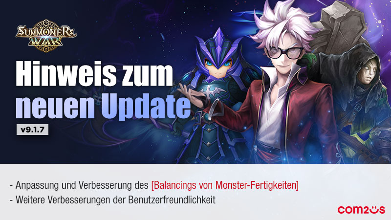 EVENT Hinweis zum neuen Update v9.1.7Hallo von Com2uS! Summoners War wurde auf v9.1.7 aktualisiert. Die Details dazu sind im Folgenden zu finden! * Das eigentliche Update wird durch ein automatisches Update während der Wartung durchgeführt. (Android/iOS) * Details können über den Wartungshinweis überprüft werden. ====================================== Details zum Update v9.1.7======================================▶ Das Balancing einiger Monster-Fertigkeiten wurde angepasst[Details ansehen]▶ [Belagerungskampf] Funktion zum Zurücksetzen der Verteidigungsdaten eines Verteidigungsdecks hinzugefügt- Im Menü [Verteidigung > Verteidigungsinfo > Verteidigungsdaten] können die Verteidigungsdaten der aktuell laufenden Saison und die insgesamten Verteidigungsdaten seit der Platzierung des Verteidigungsdecks zurückgesetzt werden.▶ [Dimensionsloch > Dimension Inferath] Infos zu Rang und Strategischen Informationen für "Loderndes Land der Hölle“ und "Inferath-Ruinen“ hinzugefügt- Das Menü [Rang] wurde hinzugefügt, in dem die besten Abschlussrekorde des Dungeons von Spielern auf demselben Server eingesehen werden können.- Die Info [Strategie > Strategische Formation] wurde hinzugefügt, in der die Decks von Spielern eingesehen werden können, die den Dungeon kürzlich erfolgreich abgeschlossen haben.▶ Wir möchten euch auch über Verbesserungen der Strategie-Infos informieren- Wenn ihr in [Strategie > Strategische Formation] auf die Miniaturansicht eines Monsters tippt, wird nun ein Popup mit detaillierten Infos angezeigt.- Die Infos zu den "Empfohlenen Decks für Anfänger" in den Strategie-Infos der einzelnen Dungeons wurden verbessert.: In der Detailansicht der Empfohlenen Decks für Anfänger für [Cairos-Dungeon / Riss der Welten / Dimensionsloch] wurden Rollen-Infos für jedes Monster hinzugefügt.▶ Das Erwecken von Monstern wurde verbessert, sodass ihr nun auswählen könnt, ob ihr Essenzen oder eine im Postfach lagernde Erweckungskraft verwenden möchtet▶ [Herausforderungskampf] Schaltflächen zum Sortieren/Einstellen von Monstern hinzugefügt- Monster können nach Attribut oder Angriffsgeschwindigkeit sortiert werden, und der Anzeigemodus für Angriffsgeschwindigkeit/Attribute kann eingestellt werden.▶ In der Gildenkampf-Forschung und auf dem Bildschirm zum Testen von Verteidigungsdecks werden nun Benachrichtigungen für Auto-Kampf und Erkundungskampf angezeigt▶ [Welt-Arena] Ab Saison 37, die am 13. April beginnt, wird die Welt-Arena erneuert- Hier sind die wichtigsten Änderungen der Saison 37.=================================- Zeitplan der Welt-Arena Saison 37: 13. April, 09:00 Uhr - 27. Juni, 09:00 Uhr (MESZ)- Das Matchmaking der Welt-Arena wird verbessert.: Im Bereich [Richter★ - Legende] wird das Matchmaking verbessert, sodass Gegner mit ähnlicheren Siegespunkten als bisher gefunden werden.: Im Bereich [Herausforderer★ - Kämpfer★★★] wird der Matchmaking-Bereich erweitert, damit Matches schneller zustande kommen.- Im Grad [Richter★] wird geändert, dass die Siegespunkte bei einer Niederlage nicht unter 800 fallen können.- Die für den Aufstieg im Bereich [Eroberer] erforderliche Anzahl an Medaillen wird geändert.- Die Belohnungen für Welt-Arena Saison 37 findet ihr in den untenstehenden Tabellen.※ Saison-Belohnungen können wie bisher nur erhalten werden, wenn in der entsprechenden Saison mindestens 10 Welt-Arena-Kämpfe abgeschlossen wurden.- Im [Welt-Arena Shop] werden neue exklusive Saison-Items hinzugefügt.: Die Items der vorherigen Welt-Arena Saison 21 werden als neue exklusive Saison-Produkte hinzugefügt und können während der Saison 37-38 gekauft werden.(Exklusive Saison-Produkte werden nach Verkaufsende in den Liga-Shop verschoben.)- Die Liste der Unterstützungsmonster für Welt-Arena Saison 37 wird wie folgt geändert.▶ Wir möchten euch über den Zeitplan und die Überarbeitung der [Sonderliga] informieren- Turnierzeitplan: 30. März, 09:00 Uhr - 12. April, 17:00 Uhr (MESZ)- Auswertungszeitplan: 12. April, 17:00 Uhr - 13. April, 05:00 Uhr (MESZ)- Ab dieser Sonderliga werden einige Regeln geändert. Bitte beachtet die folgenden Informationen.: Die Mindestanzahl an Siegespunkten, die bei einer Niederlage verloren gehen, werden von 0 → 900 geändert.: Änderungen der Siegespunkte in Kämpfen gegen Beschwörer, die 10 oder weniger Matches gespielt haben, werden für diese Beschwörer sowie für ihre Gegner abgeschwächt.: Mit Ende der Sonderliga wird die Mindestanzahl an Matches für den Erhalt von Belohnungen von 1 → 10 geändert.▶ Die Shop-UI und einige Produkte wurden erneuert- Das Design des Shops wurde umfassend überarbeitet und die Produktkategorien wurden neu strukturiert.- Wir möchten euch über neu hinzugefügte Produkte informieren: Unter [Personalisiert > Fortschritt] wurden die Produkte "Level-Up-Paket“ und "Entwicklungs-Paket“ hinzugefügt.: Unter [Personalisiert > Aufwertung] wurden die Produkte "Artefakt-Paket I-III“ hinzugefügt.: Was ist die Gesegnete Artefakt-Kiste?Ihr könnt aus Attribut/Typ die gewünschte Art auswählen, euch die Infos von 3 Legendären 6★ Artefakten vorab ansehen und anschließend 1 davon auswählen und erhalten.: Unter [Empfohlen > Spezial] wurde das zeitlich begrenzte Produkt "Exklusives Spezial-Paket“ hinzugefügt.* Verkaufszeitraum: Verfügbar nach dem Update-Patch vom 30.03. - 31.05., 23:59 Uhr (Serverzeit)- Wir möchten euch über einige erneuerte Produkte informieren: Unter [Personalisiert > Fortschritt] wurden die Produkte "Erweckungskraft Paket“ und "Regenbogenmon Paket“ wie folgt verbessert.: Unter [Personalisiert > Reichtum] wurden die Produkte "Manasteinpaket I-IV“ wie folgt verbessert.※ Die Kauflimits der erneuerten Produkte werden nach dem Update-Patch v9.1.7 zurückgesetzt. Daher können auch Beschwörer, die ihr bisheriges Kauflimit bereits erreicht haben, diese erneut kaufen.: Unter [Personalisiert > Reichtum] wird die Zusammensetzung des Pr
