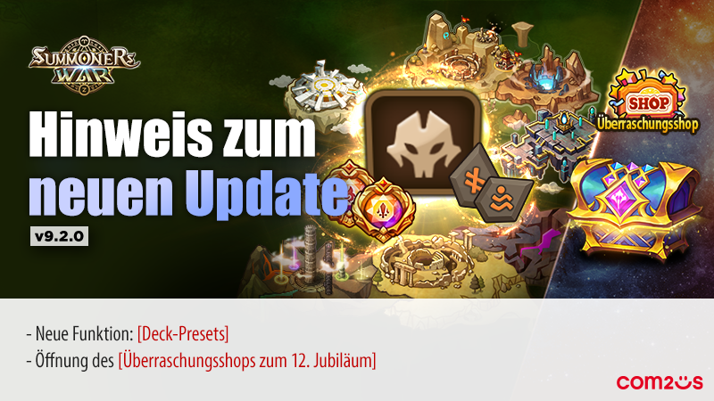 EVENT [Info] Neue Funktion: Deck-PresetsHallo vom Summoners War Entwickler-Team!Habt ihr alle viel Spaß mit den Events zur Feier des 12. Jubiläums?Heute haben wir eine weitere Entwickler-Notiz für euch vorbereitet, um euch die Deck-Presets etwas genauer vorzustellen, die wir bereits in der letzten Entwickler-Notiz erwähnt hatten.Wir haben die Deck-Presets zwar schon kurz erklärt, aber da sie für manche vielleicht noch etwas kompliziert wirken, möchten wir sie am Beispiel von Angriffsdeck-Presets im Belagerungskampf etwas ausführlicher erläutern.Im Folgenden erklären wir euch anhand von Bildern, wie Presets für Angriffsdecks des Belagerungskampfes genutzt werden können.Deck-Presets für den Belagerungskampf■ Registrierung eines ersten Presets für ein Angriffsdeck im BelagerungskampfWie beim bisherigen Laden eines Decks im Bildschirm zur Kampfvorbereitung könnt ihr ein gespeichertes Preset-Deck sofort laden oder über die Schaltfläche [Bearbeiten] zum Einrichtungsbildschirm für das Angriffsdeck wechseln.Schritt 1. Öffnet im Bildschirm zur Kampfvorbereitung das Preset-Menü.Da derzeit noch kein Deck registriert ist, wird ein leeres Pop-up angezeigt. Hier tippen wir auf die Schaltfläche [Deck hinzufügen] und gehen zum nächsten Schritt.Schritt 2. Wählt die Monster aus, die im Preset platziert werden sollen.Beim Antippen der Schaltfläche [Deck hinzufügen] wird der folgende Bildschirm angezeigt. Zuerst richten wir als erstes Angriffsdeck [Wasser-Piratenkapitän, Wasser-Meeresherrscher, Wind-Polarkönigin] ein.Wenn alle Monster für das Angriffsdeck platziert wurden, müssen die Runen und Artefakte festgelegt werden, die diese Monster verwenden sollen.Über die Schaltfläche [Runen/Artefakte einstellen] gelangt ihr zu einem Bildschirm, auf dem ihr die Runen und Artefakte für jedes Monster festlegen könnt.Schritt 3. Legt die Runen/Artefakte für die platzierten Monster fest.Es erscheint ein Bildschirm, der dem bisherigen Verwaltungsbildschirm für Runen/Artefakte ähnelt. Durch Antippen der Monster-Miniaturansicht könnt ihr die Runen/Artefakte jedes Monsters frei ändern und speichern.Da es sich nur um ein Beispiel handelt, nehmen wir einfach an, dass die Runen der Wind-Polarkönigin für dieses Deck wie folgt eingerichtet wurden.[Gespeichertes Deck 1: (Wind)-Polarkönigin]Damit ist die Einrichtung der Runen/Artefakte für dieses Angriffsdeck abgeschlossen. Wenn ihr die Änderungen nun speichert, ist die Registrierung des Presets abgeschlossen.Im Belagerungskampf werden viele verschiedene Angriffsdecks verwendet. Deshalb erstellen wir auf dieselbe Weise auch gleich ein zweites Preset.■ Registrierung eines zweiten Presets für ein Angriffsdeck im BelagerungskampfSchritt 1. Öffnet im Bildschirm zur Kampfvorbereitung das Preset-Menü.Ihr könnt nun das erste Preset sehen, das wir zuvor erstellt haben. Auf ähnliche Weise richten wir nun auch das zweite Preset ein.Schritt 2. Richtet das zweite Angriffsdeck ein.Als zweites Angriffsdeck speichern wir [Licht-Ninja, Licht-Garuda, Wind-Joker].Hier richten wir die Runen für [Licht-Garuda] ein.In der letzten Entwickler-Notiz hatten wir erwähnt, dass in den Presets Runen/Artefakte separat gespeichert werden, sodass dieselben Runen oder Artefakte erneut bei Monstern eingerichtet werden können, die bereits in verschiedenen Preset-Decks gespeichert sind.Daher ist es möglich, die Runen Nr. 1/3/5, die bereits auf der Wind-Polarkönigin eingraviert sind, wie folgt auch auf den [Licht-Garuda] einzugravieren.[Gespeichertes Deck 2: (Licht)-Garuda]Damit ist auch die Einrichtung des zweiten Presets abgeschlossen.Wenn ihr auf diese Weise verschiedene Angriffsdecks als Presets speichert, könnt ihr dieselben Runen und Artefakte gleichzeitig auf mehreren Monstern eingravieren und im Belagerungskampf einsetzen.Dadurch müsst ihr nicht mehr umständlich dieselben Runen/Artefakte immer wieder an- und ablegen, und auch ohne die Trennung der Runen für den Belagerungskampf lassen sich die Runen/Artefakte der Angriffsdecks komfortabel verwalten.(Für Verteidigungsdecks könnt ihr euch den Ablauf in ähnlicher Weise vorstellen.)Zum Schluss haben wir einige Punkte, die euch interessieren könnten, in einem kurzen Q&A zusammengefasst.=================================Q. Müssen nach dem Preset-Update und der Entfernung der getrennten Runen für den Belagerungskampf sowohl Verteidigungs- als auch Angriffsdecks neu eingerichtet werden?A. Mit dem Update werden die Monster sowie die Runen-/Artefakt-Einstellungen der bisherigen Angriffs- und Verteidigungsdecks im Belagerungskampf automatisch jeweils als Presets für Angriffs- und Verteidigungsdecks im Belagerungskampf registriert.Q. Was passiert mit den Runen-/Artefakt-Einstellungen im Belagerungskampf von Monstern, die nicht in einem Angriffs- oder Verteidigungsdeck registriert sind, wenn die getrennten Runen für den Belagerungskampf entfernt werden?A. Durch die Entfernung der getrennten Runen für den Belagerungskampf bleiben bei allen Monstern nur noch die grundlegenden Daten erhalten. Falls ihr die Runen-/Artefakt-Infos von Monstern speichern möchtet, die nicht in einem Angriffs-/Verteidigungsdeck registriert sind, empfehlen wir euch, vor dem Update die Funktion [Belagerungskampf > Monster] Runen verwalten > Einstellungen > Runen/Artefakte aller Monster speichern zu nutzen und sie im Voraus zu sichern.Q. Ihr habt erwähnt, dass man mit Presets dieselben Runen oder Artefakte auch auf Monstern anderer Decks eingravieren kann. Ist das auch bei anderen Monstern innerhalb desselben Decks möglich?A. Innerhalb desselben Decks können dieselben Runen oder Artefakte nicht auf anderen Monstern eingraviert werden. Am besten könnt ihr es euch so vorstellen, dass Runen und Artefakte pro Preset verwendet werden können.Q. Fallen beim Speichern und Verwenden von Presets Kosten an?A. Für das Speichern und Verwenden von Presets fallen keine zusätzlichen Manastein-Kosten an. So wie bei der bisherigen Trennung 