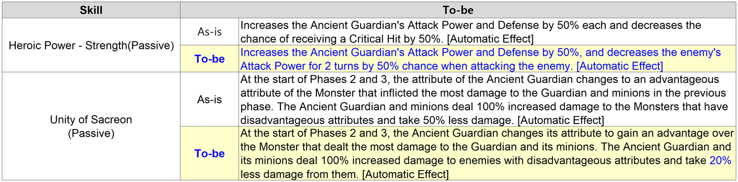 : [Sacreon Dimension - Castle of Forgotten Heroes] The Ancient Guardian's skills have been modified as follows.