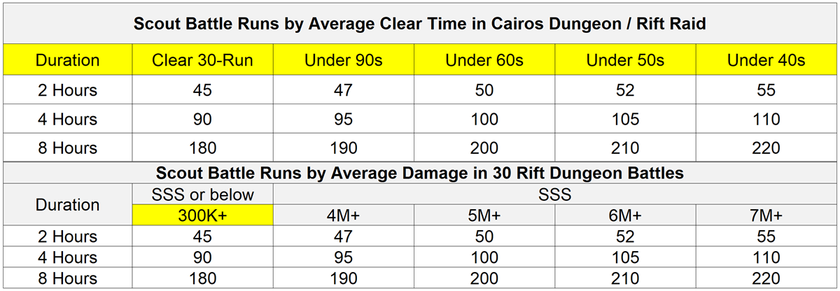 : Clear a 30-time Repeat Battle in Cairos Dungeon or Rift Raid eligible for Scout Battle.