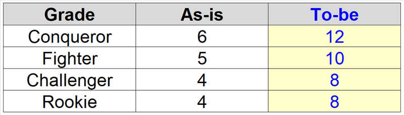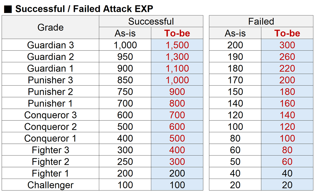 - Glory EXP granted based on successful / failed attacks will be increased as follows.