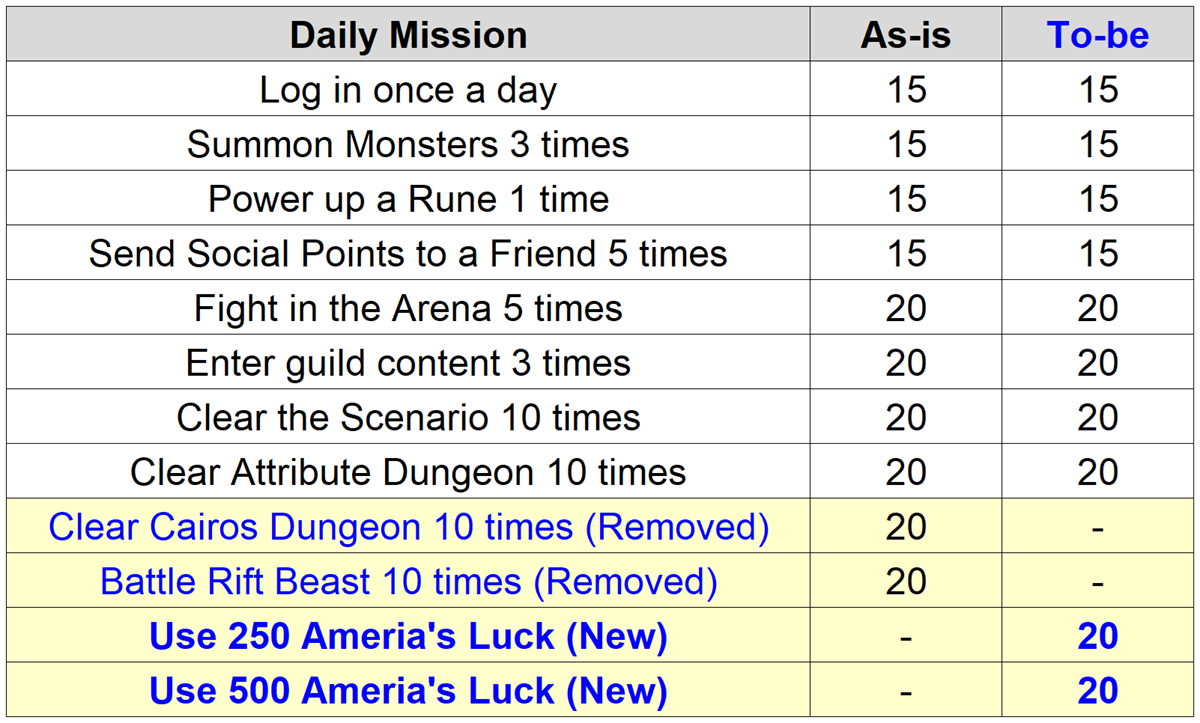 - Ameria's Luck resets daily at 12:00 AM (server time). Even if the remaining Luck is less than the Energy required to enter a dungeon, the effect will still apply for that battle. Luck is not consumed upon defeat.