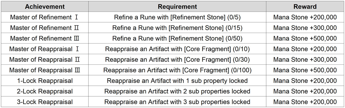 ▶ [Mission > Achievement] New Achievements on Rune Refinement and Artifact Reappraisal