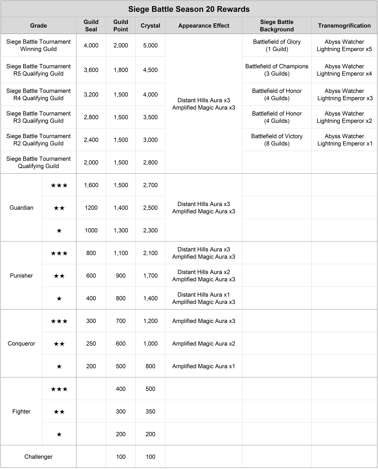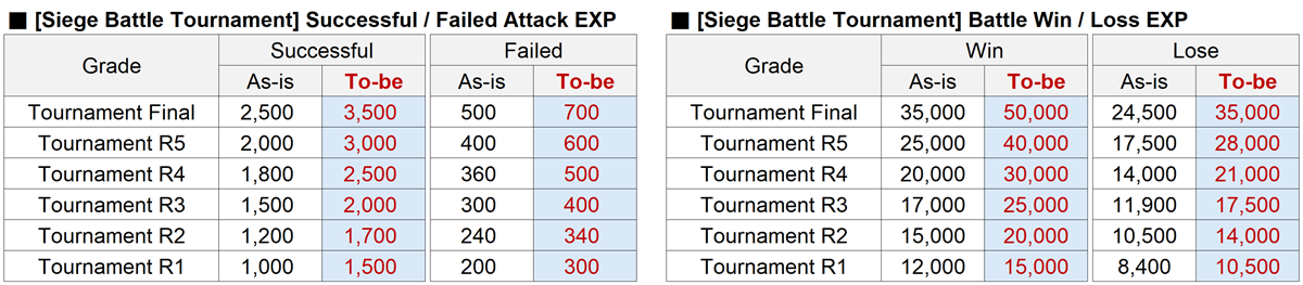 - Siege Battle EXP obtained for participating in the Siege Battle Tournament will be increased as follows.