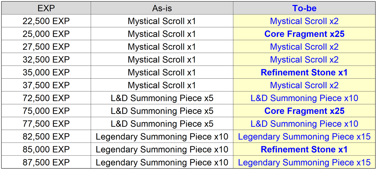 - Certain ranges of Siege Battle EXP rewards obtained from Siege Battles will be increased, and the new items Core Fragment and Refinement Stone will be added to the reward list.