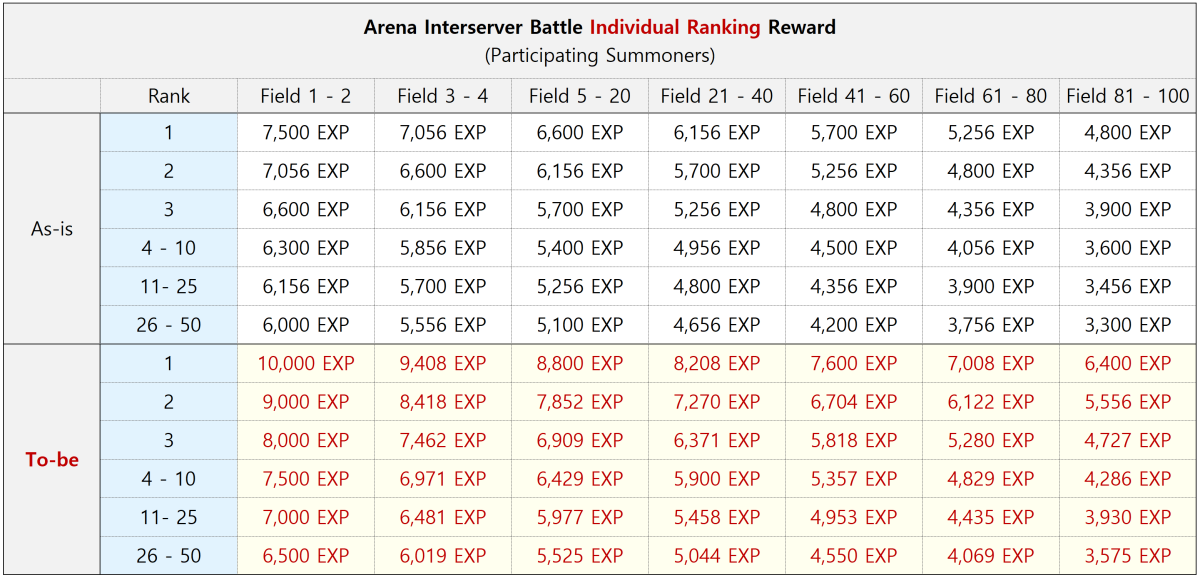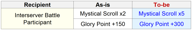 - Base rewards for participants selected for Arena Interserver Battle will be increased.