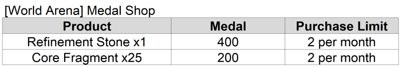 - Two new items (Refinement Stone and Core Fragment) will be added to the World Arena Medal Shop.