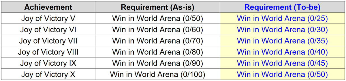- Some World Arena achievement requirements will be adjusted.