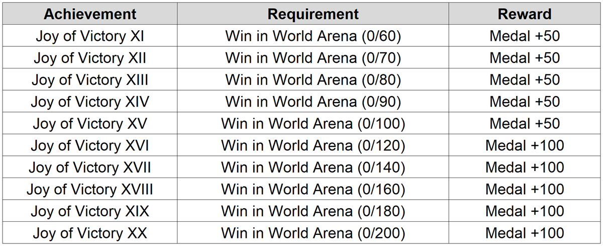 - Some World Arena achievement tiers will be expanded.