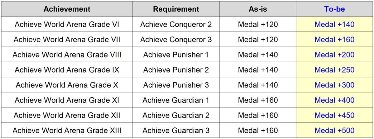 - Some World Arena Medal rewards will be increased.