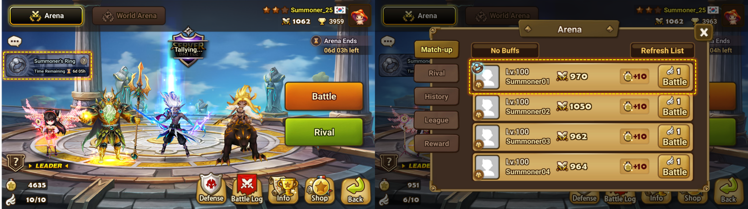 : Each week, Summoners can obtain [Summoner's Ring] through Arena battles. Rewards will be granted to Summoners who possess [Summoner's Ring] at the end of the week.