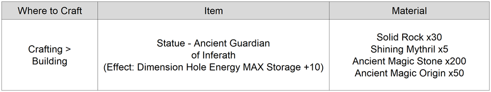 - [Craft > Building] After clearing Level 5 of the Inferath Dimension Dungeon, you can craft Statue - Ancient Guardian of Inferath.