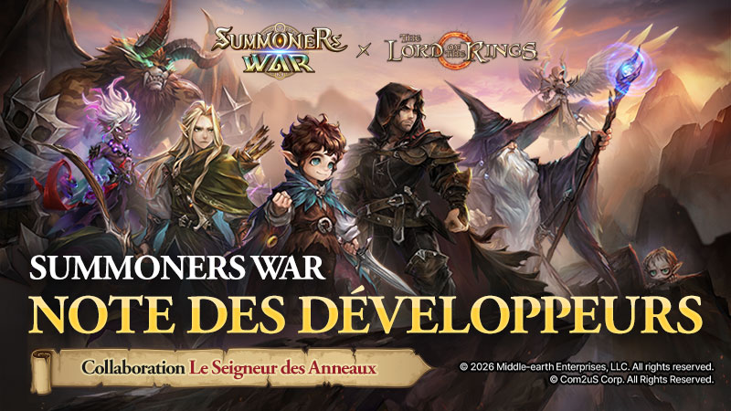 Salutations de l'équipe des développeurs de Summoners War !Avant tout, nous vous souhaitons une nouvelle année remplie de joie et de bonnes choses.Aujourd’hui, nous vous avons préparé des nouvelles au sujet de la nouvelle collab que de nombreux Invocateurs attendaient !Le 29 janvier prochain, la collab « Le Seigneur des Anneaux » × Summoners War commencera.Pour nous aussi, une collab qui ajoute un nouvel univers et une nouvelle histoire à Summoners War est toujours un moment mêlant excitation et réflexion.Afin d’intégrer l’univers du Seigneur des Anneaux, aimé depuis si longtemps, à la manière de Summoners War, nous avons travaillé avec soin sur chaque détail, de la composition des personnages à l’ensemble du contenu.Nous espérons également que cette collab Le Seigneur des Anneaux vous offrira beaucoup de plaisir et une expérience de jeu mémorable !Avant de vous présenter cette note des développeurs, nous avons préparé une vidéo des développeurs consacrée à la collab.Regardez-la via le lien ci-dessous ![ ▼ Regarder la vidéo des développeurs ▼ ]https://youtu.be/2oL5pKr5cng​​■ Summoners War × Le Seigneur des Anneaux​Le 30 janvier, les protagonistes de cette épopée légendaire autour de l’Anneau Unique, réinterprétés dans le style de Summoners War, débarqueront sur l’Île céleste.Le Seigneur des Anneaux (The Lord of the Rings), œuvre majeure de high fantasy écrite par J. R. R. Tolkien, raconte une vaste épopée se déroulant en Terre du Milieu (Middle-earth), centrée sur les conflits et les choix provoqués par l’Anneau Unique (The One Ring).Publié pour la première fois dans les années 1950, il est aimé des lecteurs du monde entier depuis des décennies, et est souvent considéré comme un pilier fondateur du genre fantasy.Parmi les nombreux personnages liés à l’Anneau Unique, nous avons choisi cinq figures particulièrement marquantes, aux rôles et symboles forts, que nous vous présenterons dans une interprétation propre à Summoners War, sous un jour tout à fait unique.Sans plus attendre, découvrons les personnages clés du Seigneur des Anneaux qui deviendront bientôt vos compagnons !■ Personnages de collab Le Seigneur des AnneauxNous avons sélectionné cinq personnages de collab parmi ceux qui marquaient déjà fortement l’œuvre originale : [Frodon, Gandalf, Aragorn, Legolas et Gollum].​Frodon, au cœur du voyage, avançant pour accomplir sa mission : détruire l’Anneau UniqueGandalf, le Magicien Gris qui a protégé la Communauté de l’Anneau grâce à sa sagesse et à sa magie Aragorn, héritier légitime et guide fiable de la Communauté de l’Anneau Legolas, guerrier elfe qui renverse le cours des événements grâce à sa grande perception et à son agilité Gollum, figure symbolisant l’obsession et la dualité, corrompue par la tentation de l’Anneau Unique Nous avons réinterprété ces personnages emblématiques, chacun doté de son propre charme, à la manière de Summoners War, afin de vous offrir un nouveau plaisir de jeu.Comme pour les précédentes collabs, les personnages de collab seront ajoutés uniquement sous forme éveillée, et conserveront le nom propre du personnage. Notez également que certains personnages de collab existeront à la fois en versions 4★ et 5★ selon l’attribut.Vous vous demandez peut-être quel personnage pourra être obtenu via les évènements de cette collab : Frodon apparaîtra uniquement en 5★ naturel d’attribut Eau, et sera disponible via un évènement.Pour plus de détails, veuillez consulter le tableau ci-dessous.Nous imaginons que ce qui vous intrigue le plus, c’est de découvrir comment les capacités et compétences des personnages de l’œuvre originale ont été adaptées dans Summoners War. Pour vous faire plaisir, nous allons donc vous dévoiler en avant-première un aperçu de certaines de leurs compétences.​​​Nous avons longuement réfléchi à la meilleure façon d’intégrer, dans notre jeu, les récits et personnalités de ces personnages si uniques et attachants du roman « Le Seigneur des Anneaux ».En particulier, en tenant compte de la nature des combats au tour par tour de Summoners War, nous avons déployé beaucoup d’efforts pour retranscrire ces éléments à travers divers effets de compétences et mises en scène.Par exemple, Legolas, qui a joué un rôle majeur au sein de la Communauté de l’Anneau, est un elfe dont l’agilité et l’adresse à l’arc sont particulièrement marquantes. Dans Summoners War, nous avons cherché à mettre en avant ces traits en concevant des effets de compétences capables d’influencer le cours du combat grâce à une vitesse d’attaque élevée.De plus, nous avons également travaillé sur les animations de combat afin qu’elles reflètent pleinement son identité d’elfe archer, en combinant la vivacité propre aux archers et l’élégance des mouvements des elfes.Nous espérons que, grâce aux caractéristiques des compétences et aux animations de combat de ces personnages, vous pourrez apprécier toute leur personnalité et leur charme uniques.Nous sommes aussi très curieux de connaître vos impressions après avoir découvert ces compétences !Vous vous demandez sans doute quels seront les compétences des autres attributs encore non dévoilés, mais soyez assurés que nous travaillons d’arrache-pied pour vous les présenter sous leur meilleur jour, alors nous vous demandons juste un peu de patience !Jusqu’à présent, nous avons toujours proposé divers contenus exclusifs afin que vous puissiez profiter pleinement de nos collabs. Alors, quels contenus vous attendent pour cette collab « Le Seigneur des Anneaux » ? Découvrons-les ensemble, un par un.■ Bâtiment évènementiel exclusif de collab : Mordor​Le « Mordor » sera la zone aménagée afin de regrouper les différents contenus de la collab en un seul endroit pour vous permettre d’