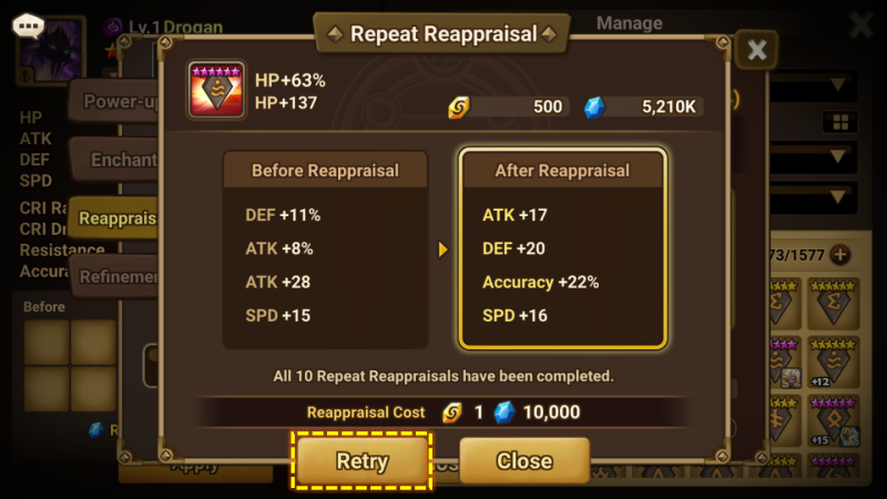 - Une fonction [Retenter] a été ajoutée : après avoir sélectionné un résultat sur l’écran de résultats de la réévaluation en série des runes ou de la conversion en série des artéfacts, vous pouvez relancer l’opération en conservant les propriétés définies précédemment.