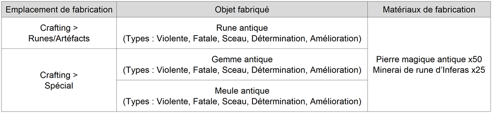 - [Crafting > Fabrication de rune antique] Vous pouvez fabriquer les runes antiques, gemmes antiques et meules antiques obtenues en récompense dans la dimension Inferas.