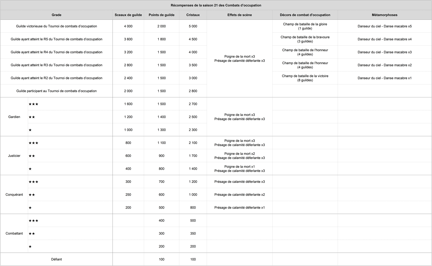 Les récompenses de la saison 21 des Combats d’occupation sont les suivantes :