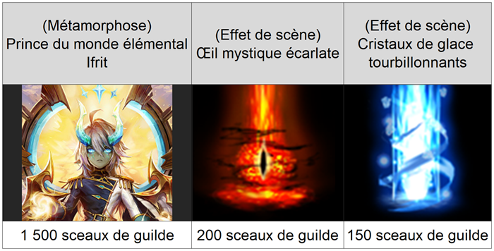 - 2 effets de scène issus des récompenses de la saison 11 des Combats d’occupation, « Œil mystique écarlate » et « Cristaux de glace tourbillonnants », ainsi que la métamorphose « Ifrit - Prince du monde élémental », ont été ajoutés.
