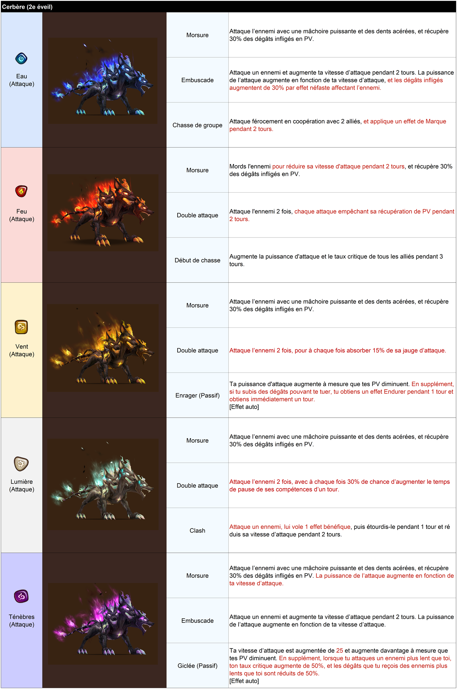 - La vitesse d’attaque des Cerbères (tous les attributs) est modifiée. (Avant éveil : 114, Après éveil : 115)