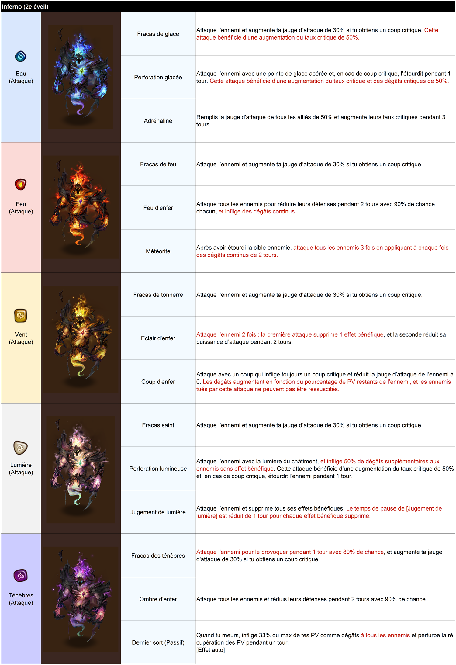 - La vitesse d’attaque des Infernos (tous les attributs) est modifiée. (Avant éveil : 97, Après éveil : 98)