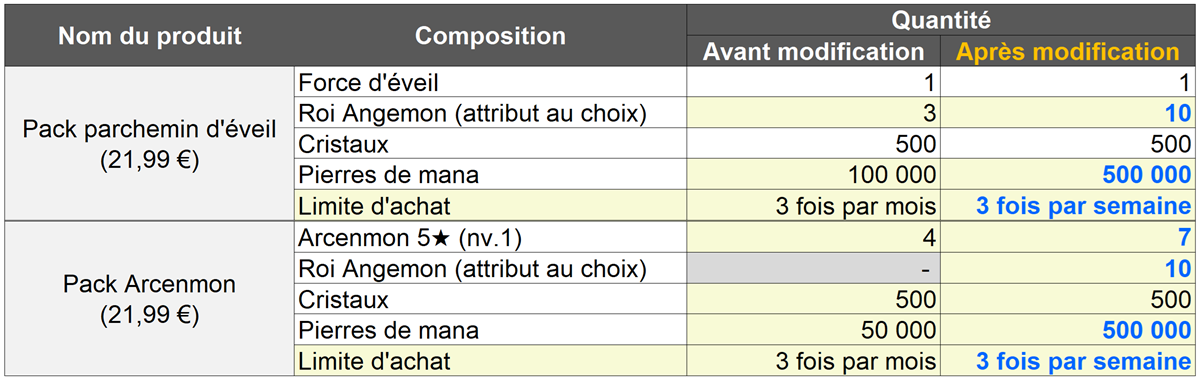 : La vente des produits [3 packs spéciaux / Pack énergie/mana / Pack Croissance de monstre], qui étaient proposés en rotation, a pris fin.
