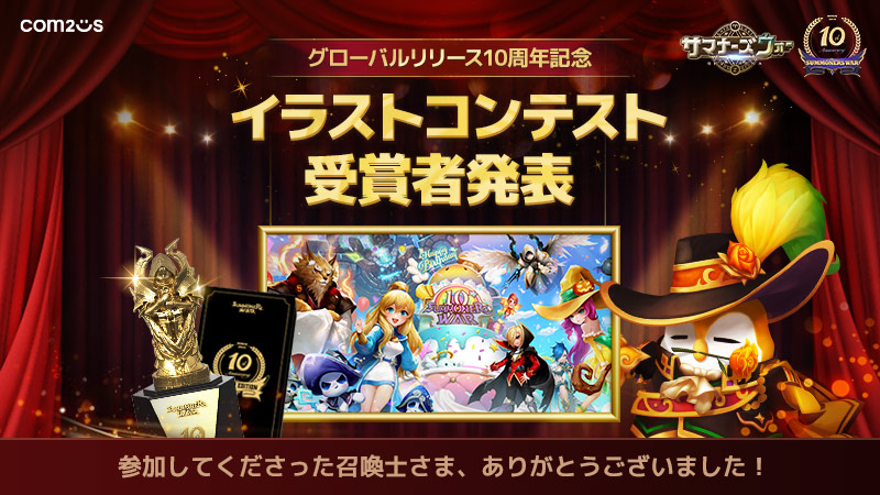 いつも『サマナーズウォー』をプレイしていただき、誠にありがとうございます。《グローバルリリース10周年記念イラストコンテスト》に参加してくださった全ての召喚士さまに感謝いたします!今回のイラストコンテストは『サマナーズウォー』との10年間を振り返って10周年をお祝いするフェス、もしくは召喚士さまが経験した最高の瞬間を自由に描いていただくというテーマで開催されました!本当に多くの召喚士さまが、心を込めた素敵な作品を提出してくださったおかげで『サマナーズウォー』のグローバルリリース10周年をより盛り上げることができました。今回のイラストコンテスト受賞作品は「受賞作品GALLERY」ページにて公開されています。GALLERYページではステキな作品の鑑賞はもちろん、「10周年イラストコンテスト受賞作品紹介動画」を視聴すると不思議な召喚書を3枚もらえるキャンペーンも実施中ですので、ぜひお受け取りください!《10周年イラストコンテスト受賞作品紹介動画を見る》https://youtu.be/EHiVddxTd1s*10周年イラストコンテスト受賞作品GALLERYで動画を視聴すると[不思議な召喚書×3]を獲得できます。 ぜひお受け取りください。ゲーム内での天空の島の右側の「EVENT ⇒ 「イベント」タブ ⇒ グローバルリリース10周年記念イラストコンテスト受賞作品GALLERY」で確認できます。では、受賞作品を発表いたします!*各部門で受賞者が個別に選定されるのではなく、部門に関係なく受賞者が選定されました。☆最優秀賞(10名):賞金1,000ドル、10周年記念トロフィー×1、クリスタル+500-WANISM- (「10周年記念フェス」部門/アジアサーバー)串仙贝 (「10周年記念フェス」部門/中国サーバー)闇之羽 (「10周年記念フェス」部門/アジアサーバー)왜초기화됨? (「最高の瞬間」部門/韓国サーバー)BoyInscarlet (「10周年記念フェス」部門/グローバルサーバー)Chonky_ShyGuy (「10周年記念フェス」部門/グローバルサーバー)Kitseru-san (「10周年記念フェス」部門/ヨーロッパサーバー)KURISUKE (「10周年記念フェス」部門/日本サーバー)NKayTee (「10周年記念フェス」部門/アジアサーバー)タエローン (「10周年記念フェス」部門/日本サーバー)★優秀賞(30名):10周年記念トロフィー×1、クリスタル+500★奨励賞(60名):クリスタル+300受賞された方々に、あたらめてお祝い申し上げます。《グローバルリリース10周年イラストコンテスト》の参加者の方々、そして応援してくださった召喚士の皆様、本当にありがとうございました!※最優秀賞/優秀賞受賞者へのご案内※受賞者発表後、最優秀賞/優秀賞を受賞した方には、ご応募の際に提出していただいた連絡先(Eメールアドレスおよび携帯電話番号)に、賞金・賞品発送に必要な情報提出についての案内をお送りします。届いたメールをご確認の上、2024年8月4日 23:59(JST)までに、記載されたフォーム通りに必要な情報を作成して提出してください。*最優秀賞受賞者の方は案内メールに記載された提出フォームから必要な情報を提出し、賞金受領のために必要な通帳の写しなどの資料を添付してご返信ください。*期限までに提出されなかった場合は、賞品を受領する意思がないものとみなし、受賞を無効とさせていただきます。*お住まいの地域によっては賞品の発送が難しい場合があります。こうした場合は別途でご案内いたします。*最優秀賞/優秀賞を受賞した方で、結果発表日から3日が過ぎてもPC用メールアドレスまたは携帯電話番号に案内連絡が届いていない場合は、お手数ですがHIVE1:1お問い合わせまでご連絡ください。------------------------------------------------------------------------※チェック!・10周年記念トロフィーには[光と闇の召喚書×1、デビルモン×1、クリスタル+500、不思議な召喚書×10]を獲得できるクーポンが含まれます。・ゲーム内アイテム賞品は2024年7月25日よりプレゼントボックスに順次配布いたします。・コンテスト参加規約を遵守していない作品は、受賞選定対象から除外されました。・召喚士名やサーバー名に誤りがある場合は応募を無効とさせていただきました。例1)賞品配布時の召喚士名と参加時の召喚士名が異なる場合や削除された場合例2)召喚士名に特殊文字が含まれていて、確認が難しい場合