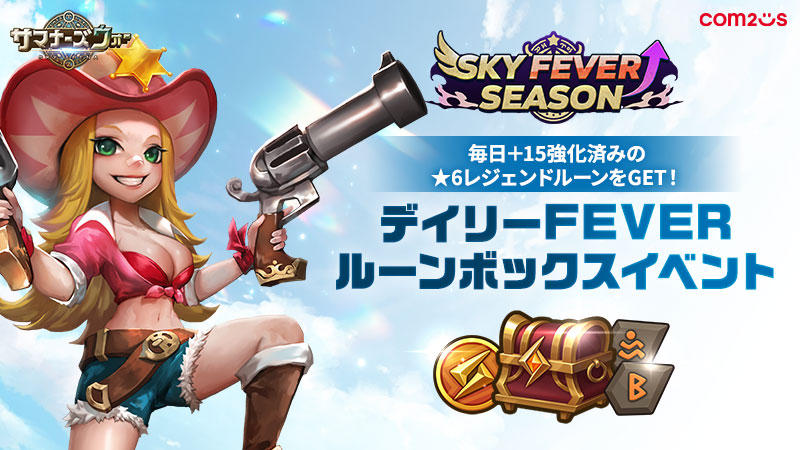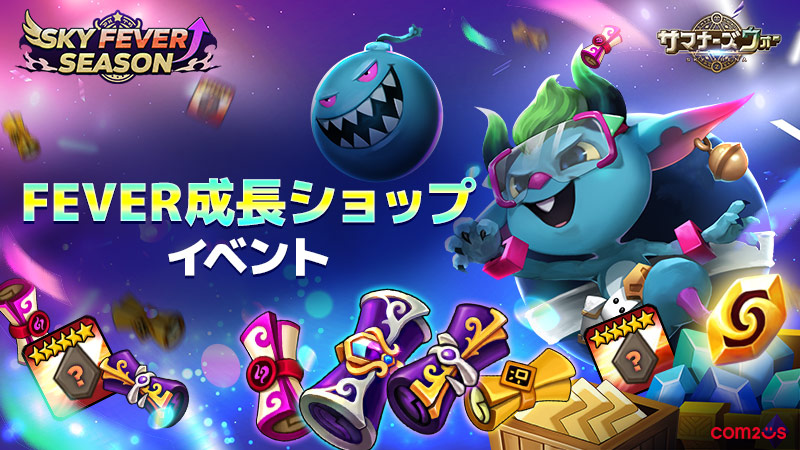 いつも『サマナーズウォー』をプレイしていただき、誠にありがとうございます。空の果てまで成長できる特別なイベントシーズン!☆SKY FEVER SEASON☆が始まります!9体の純正★5モンスターから1体を選んで[全スキルレベルMAX、★6進化、Lv.40、覚醒済み]の状態で召喚しましょう!また、水/火/風属性の純正★4モンスターを1体ずつ選んで召喚でき、スキルレベルも最大30回上げられます!詳細は下記をご覧ください。■ 期間2025年10月2日 11:00 ~ 2025年11月9日 23:59(JST)*報酬の受取期限:2025年11月10日 23:59(JST)■ 詳細[FEVERトークンの獲得方法]コンテンツプレイクリスタル獲得クリスタル消費*詳しい内容はイベントページでご確認ください。EVNET 1. 純正★5&★4モンスター召喚イベント◈ 純正★5モンスターを選択召喚/入れ替え9体のリストから[好きな純正★5モンスター1体]を選んで、[全スキルレベルMAX、★6進化、Lv.40、覚醒済み]の状態で召喚しましょう!召喚した後、1回に限りモンスターを入れ替えることができます!▶ 純正★5モンスター召喚:FEVERトークン-500個▶ 純正★5モンスター入れ替え:FEVERトークン-500個*召喚したモンスターは[10月20日 00:00(JST)]以降、1回に限り入れ替えることができます。*召喚されたモンスターの情報を確認できない場合は入れ替えることができません。(古代クォーツへの変換、召喚解除、プレゼントボックスからの未受領など)*モンスターを入れ替えた場合、入れ替える前のモンスターは召喚解除され、新しく入れ替えたモンスターが全てのスキルレベルMAX/★6進化/Lv.40強化済みで召喚されます。*このイベントで召喚したモンスターを入れ替えた場合、入れ替える前のモンスターのモンスターコレクション登録情報は消えます。[純正★5モンスターリスト]◈純正★4モンスターを選択召喚水/火/風属性の純正★4モンスターを[1体ずつ]選択して召喚しましょう!▶ 純正★4モンスター召喚:FEVERトークン-200個*純正★4モンスター召喚は各属性につき1体ずつ召喚できます。*純正★4モンスターを召喚した後に入れ替えることはできません。EVNET 2. 純正★4モンスタースキルレベルUPイベント純正★4モンスターのスキルレベルを最大30回上げられます!▶ 純正★4モンスターのスキルレベルアップ1回:FEVERトークン-100個(最大30回)*純正★4モンスターのスキルレベルUPは、保有中のモンスターのうち全てのスキルレベルがMAXになっていないモンスターが対象となります。*モンスターインベントリーの純正★4モンスターのみ選択可能です。モンスター保管庫およびモンスター封印所のモンスターは選択できません。※チェック!*イベント報酬はイベント終了の24時間後までにお受け取りください。*イベント開始後に新たに追加された純正★4モンスターは、純正★4モンスター召喚およびスキルレベルUP対象に含まれません。*イベント開始前からゲームをプレイしていると、イベント適用が遅れる場合がございます。お手数ですが、アプリを再起動してからご参加ください。*報酬が見当たらない場合はアプリを再起動してプレゼントボックスをご確認ください。*イベント期間及び残り時間はお住まいの国のタイムゾーンで表示されます。*お問い合わせ:https://customer.withhive.com/com2us/ask/313