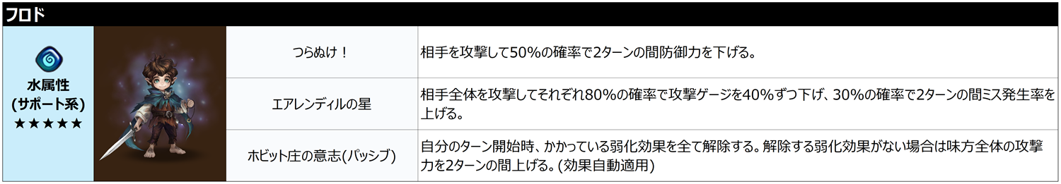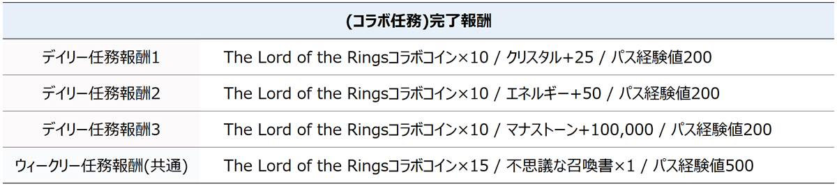 - 『The Lord of the Rings』コラボを記念した特別な召喚書です。全属性の純正★4~5のThe Lord of the Ringsコラボキャラクターの中から1体を召喚できます。「水属性」フロドは召喚できません。