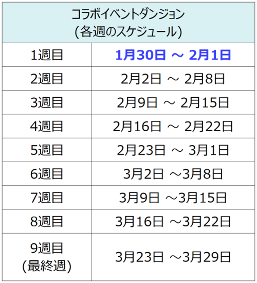 :2月2日0:00から2週目が開始し、それ以降のイベントダンジョンは毎週月曜日の0:00(各サーバー時間基準)にリセットされ、日曜日までプレイできます。