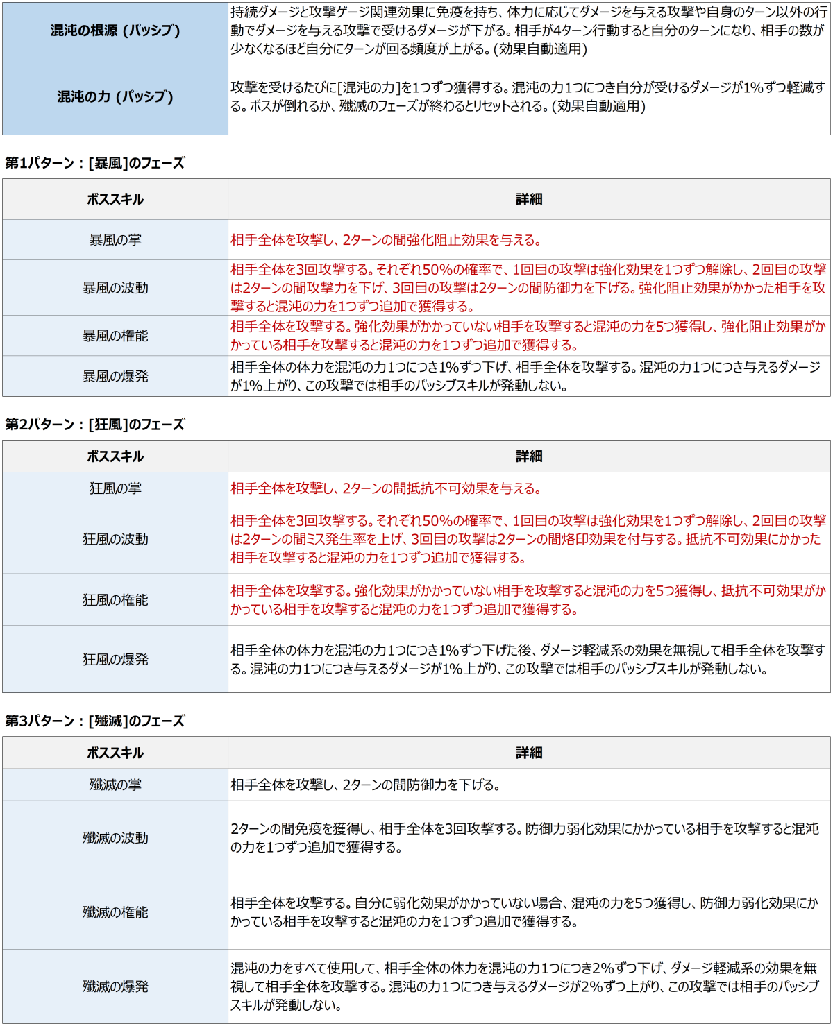 - 2月の混沌の神殿のボスは風属性で、ボスのスキルは以下の通りです。