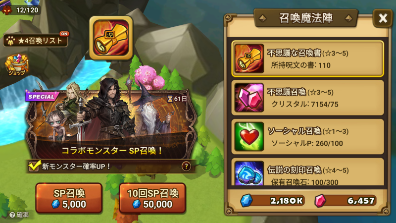 :【SP召喚】は、『The Lord of the Rings』コラボキャラクターが登場する確率が通常の召喚に比べて少しだけ高くなっています。SP召喚キャンペーン期間中は、SP召喚が適用される召喚方法を選ぶと【SP召喚】メニューが表示され、チェックボックスをチェックするとSP召喚を行えます。