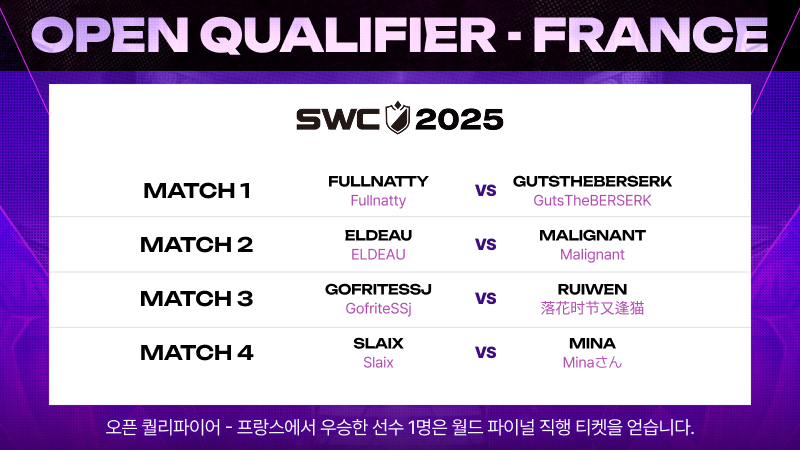 ※ [오픈 퀄리파이어 – 프랑스]에서 탈락한 선수는 월드 아레나 시즌 성적이 선발 기준에 부합할 경우, 이후 진행될 [유럽 지역 예선]에 다시 한번 참가할 수 있습니다. [유럽 지역 예선] 대진표는 [SWC2025 예선 4주차 일정 안내] 및 [SWC2025 출전 선수 안내] 공지에서 추후 공개될 예정입니다.
