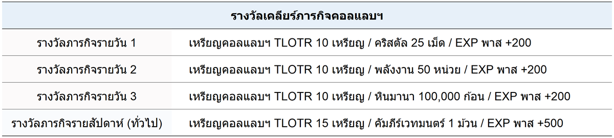 - ระยะเวลากิจกรรม : 29 ม.ค. หลังแพทช์อัปเดต v9.1.0 - 1 เม.ย. 21:59 น. (เวลาไทย)