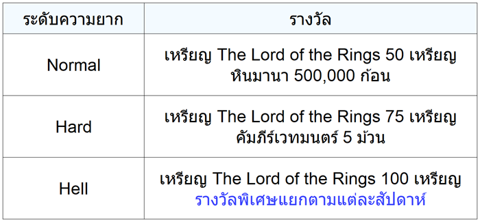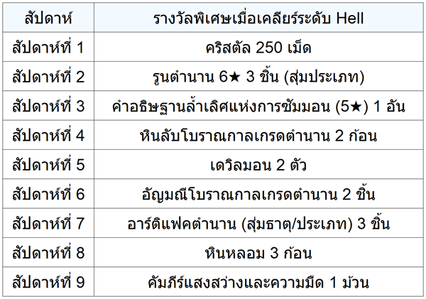 - เมื่อเคลียร์บอสของระดับ Hell ได้ จะได้รับรางวัลโบนัสของแต่ละสัปดาห์