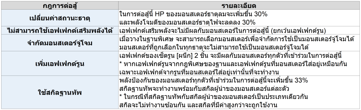 - สามารถใช้กฎพิเศษเหล่านี้ได้ผ่านเมนูทดลองต่อสู้ทางด้านขวาบนของเมนู [ตั้งรับ] หรือ [สมาชิก > ข้อมูลการต่อสู้ > วางแนวตั้งรับ]