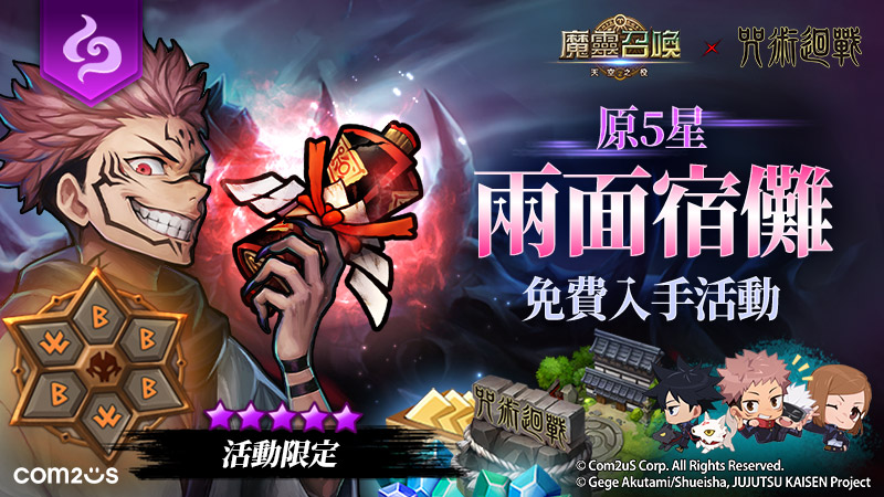 EVENT [咒術迴戰] 聯名紀念!原5星兩面宿儺免費入手活動親愛的召喚師您好 魔靈召喚 X 咒術迴戰聯名紀念! 完成聯名任務,集滿10個[兩面宿儺的手指],入手[原5星暗屬性兩面宿儺]! 透過通關獲得[原5星暗屬性兩面宿儺]時解鎖的咒術迴戰各角色任務, 帶走[咒術迴戰召喚書]、[咒術迴戰表情貼圖]、[咒術鍛鍊場]等聯名專屬特別好禮! 詳細內容如下。 ■ 活動期間 各伺服器更新後 ~ 9月30日 22:59 * 獎勵領取期限:10月1日 22:59 ■ 活動內容 [詛咒結晶獲取方法] - 劇情模式所有地區/卡伊洛斯地下城/異界地下城/異界團戰/次元黑洞掉落 - 聯名遊戲內容 : 咒術迴戰聯名地下城 / 咒術高等專門學校 / 競技場對戰召喚師 X * 詛咒結晶獲得量詳細內容,請於活動開跑後至活動頁面查看。 * 將針對全新召喚師加碼發送詛咒結晶。 - 全新召喚師 : 於4月11日 23:00起全新創建的召喚師帳號 * 詛咒結晶可於活動期間透過指定模式掉落/獲得及消耗紅水晶無限制獲得。 * 透過活動獲得的紅水晶將不列入計算。 EVENT 1. 每天收集[詛咒結晶],帶走每日好禮! 詛咒結晶x60 : 魔力石+200,000 詛咒結晶x120 : 能量+100 詛咒結晶x180 : 能量+50 詛咒結晶x240 : 能量+50 詛咒結晶x300 : 能量+50 * EVENT 1的任務及獎勵將於每日23:00重置。 EVENT 2. 每次完成聯名任務,將可入手[兩面宿儺的手指], 集滿10個兩面宿儺的手指,帶走[原5星暗屬性兩面宿儺]! <聯名任務列表> - 收集詛咒結晶x150 - 戰勝召喚師 X 1次 - 聯名特別召喚1次 - BOSS RUSH通關1 WAVE以上1次 - 通關聯名地下城(Normal)1次 - 通關聯名地下城(Hard)1次 - 完成咒術師任務1次 - 完成咒術師任務2次 - 完成咒術師任務3次 - 觀看聯名影片 ※ 可至收件箱領取鑲嵌符文套裝的原5星兩面宿儺。 EVENT 3. 入手[原5星暗屬性兩面宿儺]並解鎖咒術迴戰各角色任務, 根據任務完成總數,帶走[咒術迴戰召喚書]、[咒術迴戰表情貼圖]、[咒術紀念雕像]、[咒術鍛鍊場]等聯名專屬特別好禮! * 該活動將於獲得原5星兩面宿儺時開放。 <兩面宿儺的任務> 獲得詛咒結晶 : 300個 / 600個 / 1200個 / 1500個 <釘崎 野薔薇的任務> 完成咒術師任務 : 10次 / 20次 / 30次 / 40次 <伏黑 惠的任務> 戰勝召喚師 X : 1次 / 3次 / 5次 / 10次 <虎杖 悠仁的任務> 通關BOSS RUSH : 第1週10 Wave / 第2週10 Wave / 第3週10 Wave / 第4週10 Wave <五條 悟的任務> 通關聯名地下城BOSS : 1次 / 3次 / 5次 / 10次 任務完成累計達2次 : 聯名紀念建築 [紀念雕像] 任務完成累計達4次 : 能量+100、魔力石+200,000 任務完成累計達6次 : 3種聯名表情貼圖 - 哈囉、散步、YA 任務完成累計達8次 : 能量+100、魔力石+200,000 任務完成累計達10次 : 聯名紀念建築 [咒術鍛鍊場] 任務完成累計達12次 : 能量+100、魔力石+200,000 任務完成累計達14次 : 3種聯名表情貼圖 - 抱歉、裝傻、哼! 任務完成累計達16次 : 能量+100、魔力石+200,000 任務完成累計達18次 : 咒術迴戰召喚書x1 任務完成累計達20次 : 能量+100、魔力石+200,000 * 咒術迴戰各角色任務開放前達成的內容將追溯套用。 * 咒術師任務可透過天空之島右上方的[咒術高等專門學校]查看。 * 無論聯名地下城BOSS難度高低,每次通關都將列入任務計算。 ★ 咒術迴戰召喚書 * 可召喚原4~5星(水/火/風/光/暗)全屬性咒術迴戰聯名角色之一。 * 無法召喚可透過聯名活動獲得的暗屬性兩面宿儺。 ★ 聯名紀念建築 [紀念雕像]&[咒術鍛鍊場] / 6種表情貼圖 * 咒術迴戰紀念雕像 : 咒術迴戰聯名紀念雕像。 * 咒術鍛鍊場 : 共可配置5種魔靈,亦可配置除了聯名角色之外的其他魔靈。 ※ 注意事項 - 獎勵限於活動結束後24小時內領取完畢。 - 活動開始前若已經在遊戲內,請重新登入以便套用活動。 - 無法確認獎勵時,也請重新登入確認。 - 活動時間及剩餘時間,皆以居住地區時間為準。 - 活動諮詢 : Com2uS 1:1 客服 https://customer.withhive.com/com2us/ask/313