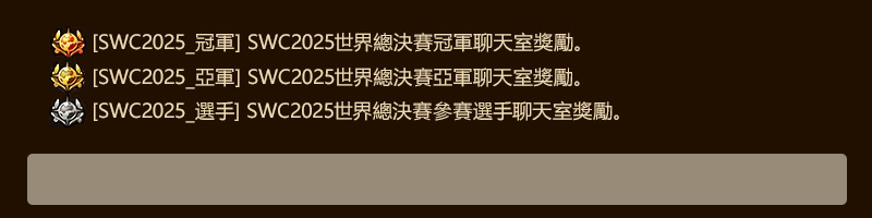 ※ 可於登入遊戲時,點擊冠軍資訊彈窗中的[領取好禮]鈕後,即可獲得SWC2025世界總決賽冠軍紀念好禮。