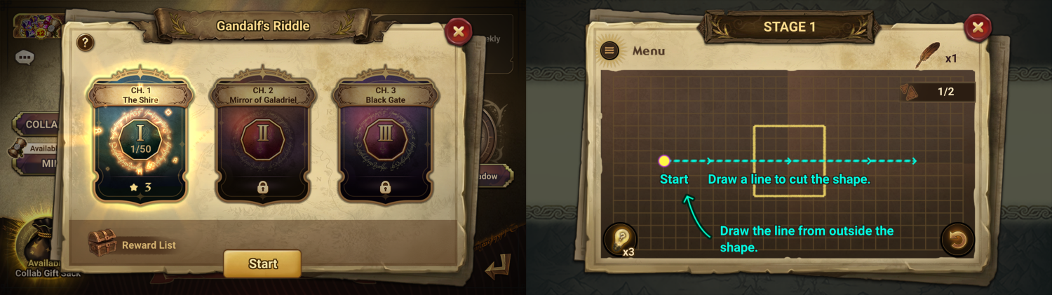 -「甘道夫的謎題」是將指定圖形在特定次數內切割至適當尺寸,分割成大小相近區塊的拼圖型迷你遊戲。