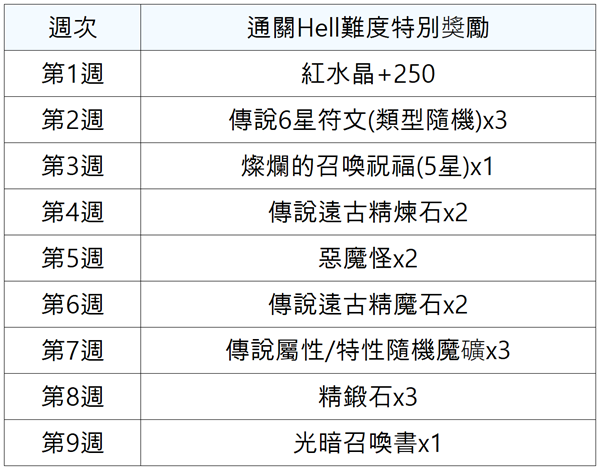 - 通關Hell難度BOSS時,可根據活動週次獲得加碼獎勵。
