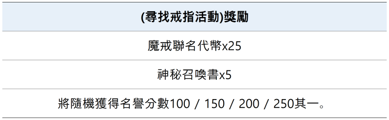 :「尋找戒指」活動共為期8週,可於每週透過競技場對戰獲得[召喚師之戒],並於該週結束時,針對持有[召喚師之戒]的召喚師發放獎勵。