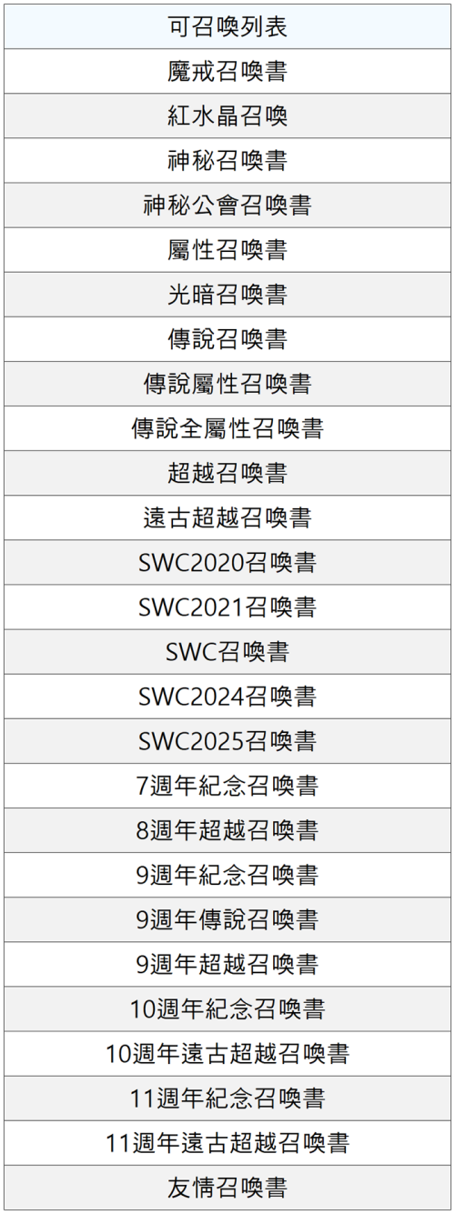 :遠古超越召喚書、11週年遠古超越召喚書、11週年紀念召喚書、刻印召喚書、魔靈碎片召喚、公會召喚及SWC召喚書等,召喚列表所選的召喚書以外所有召喚皆可進行[特別召喚]。使用的道具或召喚書、祝福等與既有召喚相同。