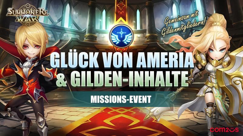 EVENT Gemeinsam mit Gildenmitgliedern! Missions-Event: Glück von Ameria & Gilden-InhalteHallo von Com2uS!Vereint euch mit euren Gildenmitgliedern und schließt gemeinsam Missionen ab, um beim [Missions-Event: Glück von Ameria & Gilden-Inhalte] verschiedene Belohnungen zu erhalten.Schließt jeden Tag die Missionen zum Glück von Ameria und zu den Gilden-Inhalten ab und sichert euch verschiedene Belohnungen.Im Folgenden findet ihr weitere Informationen dazu.■ Event-Zeitraum24. November, 00:00 Uhr - 30. November, 23:59 Uhr (Serverzeit)* Belohnungen verfügbar bis: 1. Dezember, 23:59 Uhr (Serverzeit)■ Details zum Event▶ Individuelle Missionen1. Schließe jeden Tag individuelle Missionen ab, um Belohnungen zu erhalten!<Details zu den Missionen>- Verwende 500 Glück von Ameria- Spiele 3 Mal in Gilden-Inhalten* Die Missionen werden jeden Tag um 00:00 Uhr (Serverzeit) zurückgesetzt.<Belohnungen für abgeschlossene Missionen>- 1 Mission abgeschlossen: 500.000 Manasteine- 2 Missionen abgeschlossen: 100 Gildenpunkte2. Erhalte Belohnungen entsprechend der abgeschlossenen Anzahl an individuellen Missionen!- Insgesamt 1 abgeschlossene Mission: 200.000 Manasteine- Insgesamt 3 abgeschlossene Missionen: 100 Energie- Insgesamt 5 abgeschlossene Missionen: 200 Gildenpunkte- Insgesamt 7 abgeschlossene Missionen: 2 Gravierte Schriftrollen- Insgesamt 9 abgeschlossene Missionen: 1 Aufarbeitungsstein- Insgesamt 12 abgeschlossene Missionen: 5 Mystische Schriftrollen▶ Gruppen-MissionenSchließe Missionen mit Gildenmitgliedern ab und erhalte Belohnungen!※ Der Schwierigkeitsgrad der Missionen wird entsprechend der Anzahl der Gildenmitglieder zu Beginn des Events angepasst. Auf der Event-Seite findet ihr weitere Details.1. Verwende 500 Glück von Ameria<Belohnungen für abgeschlossene Missionen>- Mission 1: 100 Energie- Mission 2: 200 Gildenpunkte + 200.000 Manasteine- Mission 3: 2 Mystische Schriftrollen- Mission 4: Je 1 Feuer/Wasser/Wind Schriftrolle + 1 Legendäre 6★ Rune (Typ auswählbar)2. Spiele Gilden-Inhalte<Belohnungen für abgeschlossene Missionen>- Mission 1: 100 Energie- Mission 2: 200 Gildenpunkte + 200.000 Manasteine- Mission 3: 2 Mystische Schriftrollen- Mission 4: 2 Gravierte Schriftrollen + 100 Kristalle※ Bitte beachten============================================* Individuelle Missionen- Gilden-Inhalte: Welt-Gildenkampf, Rivalen-Gildenkampf, Monster-Unterwerfung und Tartaros' Labyrinth werden gezählt.- Für Tartaros' Labyrinth werden nur siegreiche Kämpfe gezählt und bei zeitlich begrenzten Stufen erfolgt die Zählung am Ende des Kampfes.- Bei der Monster-Unterwerfung wird jeweils der erstmalige Abschluss der ersten und zweiten Runde gezählt.- Der Schwierigkeitsgrad der Missionen wird für Beschwörer mit Lv. 49 oder niedriger nach der Eröffnung des Events heruntergesetzt. Der heruntergesetzte Schwierigkeitsgrad wird beibehalten, auch wenn man Lv. 50 erreicht.* Gruppen-Missionen- Der Schwierigkeitsgrad der Missionen wird entsprechend der Anzahl der Gildenmitglieder zu Beginn des Events angepasst. - Jede Gruppen-Belohnung kann von bis zu 30 Mitgliedern pro Gilde eingesammelt werden.- Immateriell-Runen können nicht für die Belohnung "1 Legendäre 6★ Rune" erhalten werden.============================================- Die Belohnungen sind bis 24 Stunden nach Ende des Events verfügbar.- Bitte starte das Spiel neu, wenn du zu Beginn des Events spielst, um Verzögerungen zu vermeiden. - Bitte versuche das Spiel neu zu starten, wenn du deine Belohnungen nicht im Posteingang sehen solltest.- Die Dauer und die verbleibende Zeit des Events werden in der Zeitzone der Region angezeigt, in der sich dein Wohnsitz befindet.- Bei Fragen oder Anmerkungen wende dich bitte an unseren Kundendienst unter https://customer.withhive.com/com2us/ask/313