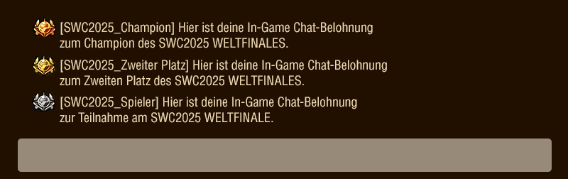Darüber hinaus erhalten die [12 Weltfinalisten der SWC2025] [In-Game Belohnungen] und ein [Chat-Emblem].