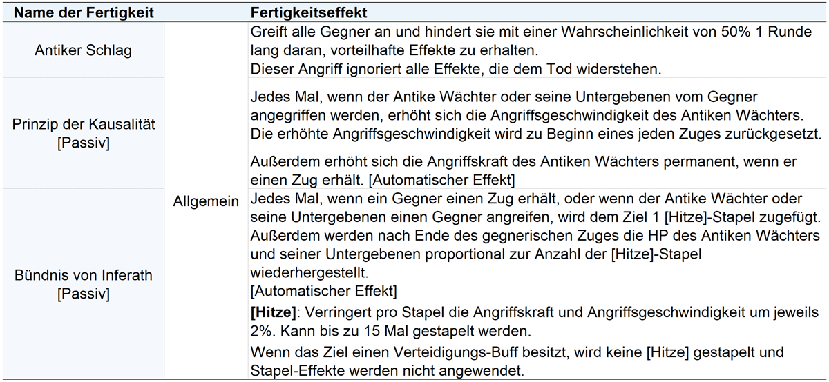 Zusätzlich zu diesen Grundfertigkeiten beschwört der Antike Wächter in jeder Phase Monster zu seiner linken und rechten Seite und verbindet ihre Kräfte, um besonders mächtige Spezial-Fertigkeiten einzusetzen.