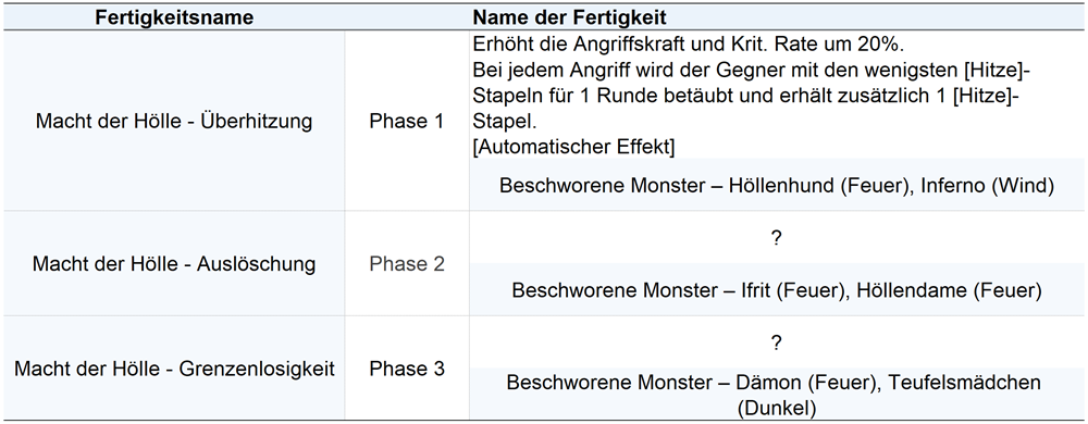 Besonders auffällig sind die Fertigkeiten von Inferno (Dunkel).