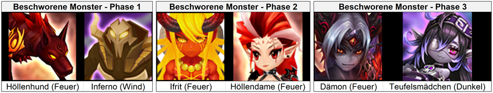 Nachfolgend findet ihr eine Übersicht der Monster, die in den einzelnen Phasen gemeinsam mit ihm kämpfen.