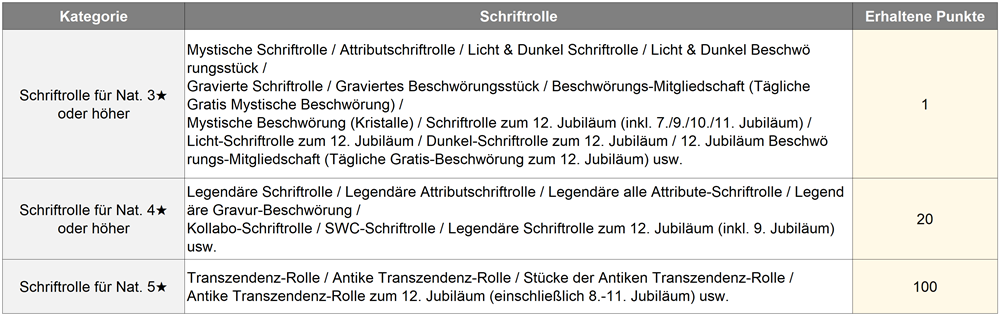 - Bei der Verwendung von Schriftrollen für Nat. 3★ oder höhere Monster im Summonhenge werden Beschwörungs-Punkte gesammelt.