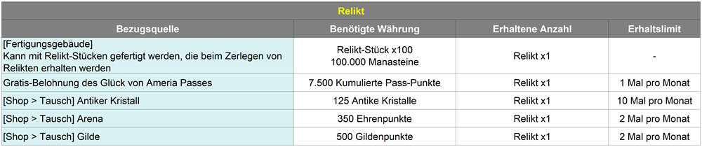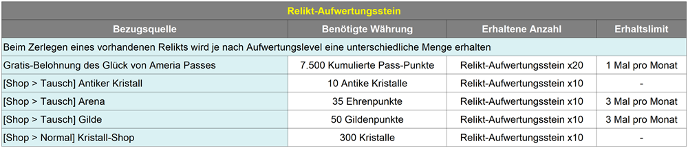 : Für die Relikt-Aufwertung werden Relikt-Aufwertungssteine und Manasteine verbraucht. Relikt-Aufwertungssteine können auf folgende Weise erhalten werden.