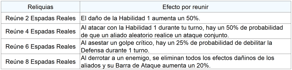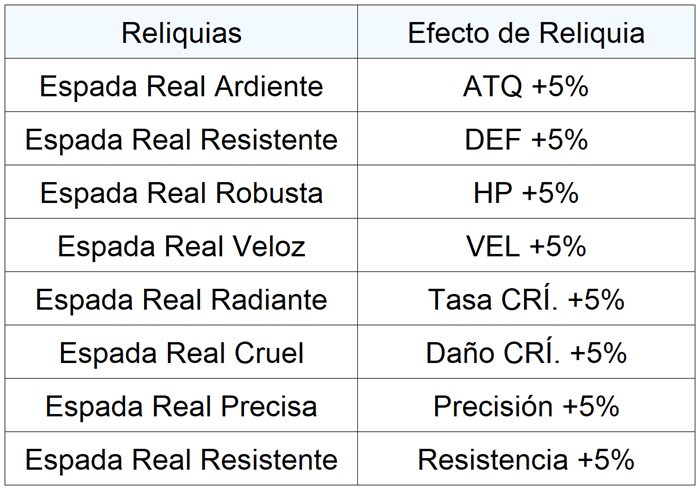 Además, al reunir varias reliquias iguales, además de que el efecto del prefijo se acumula, también se otorga un efecto especial adicional de la reliquia. En el caso de la Espada Real, se añadirán los siguientes efectos especiales según la cantidad reunida.