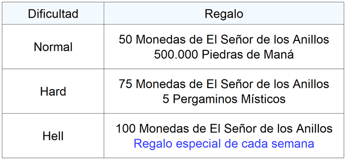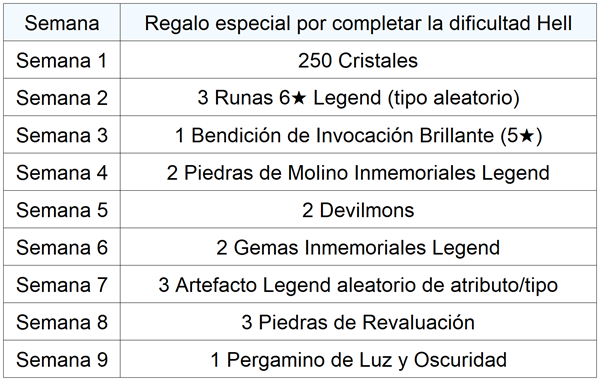 La Mazmorra del Evento se reinicia cada semana y, al completar la última Mazmorra del Evento de dificultad Hell cada semana, podrás obtener una recompensa especial según la semana. Las recompensas por semana son las siguientes.