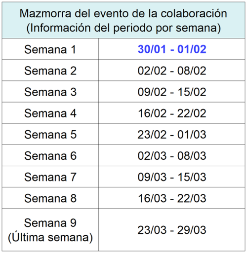 Además, en esta Mazmorra del Evento, la 1.ª semana será del 30/01 al 01/02, y la 2.ª semana comenzará inmediatamente a partir del 02/02. (La hora de reinicio será a la medianoche del domingo al lunes, según la hora del servidor).
